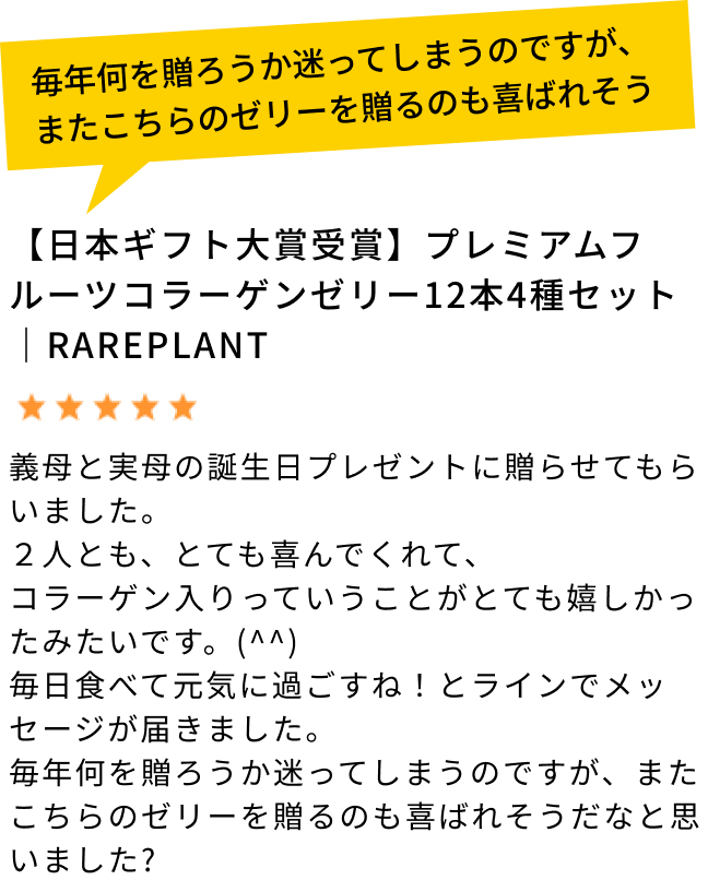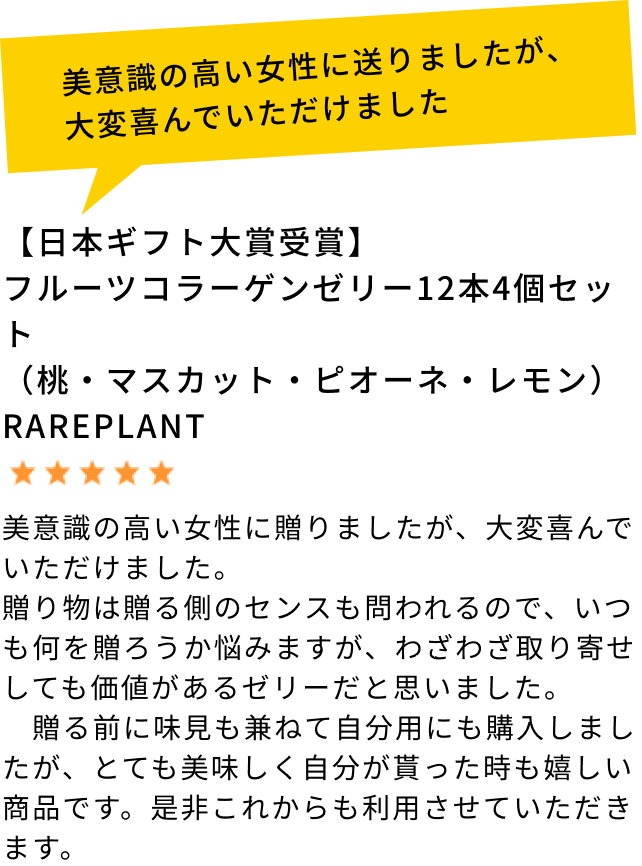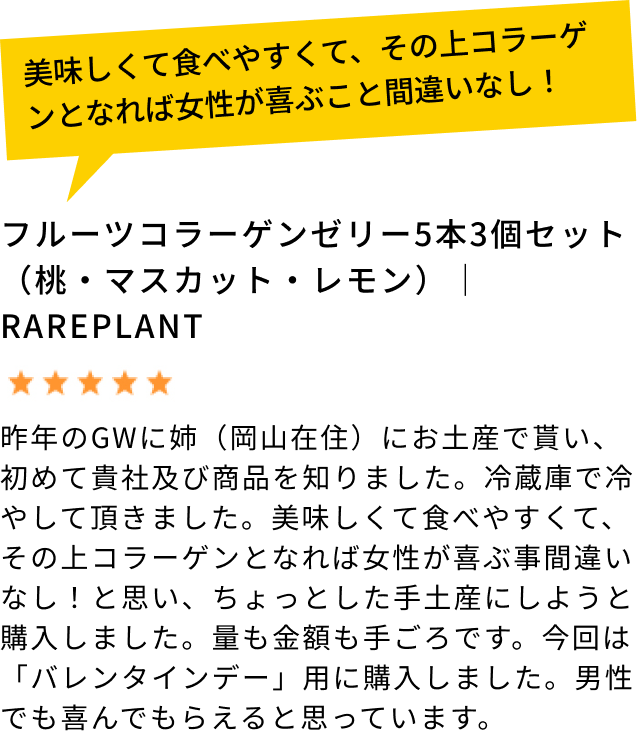 フルーツコラーゲンゼリーは、「農業の活性化」と「女性の笑顔」を願う想いから誕生しました。地元岡山の白桃やマスカット・オブ・アレキサンドリアをはじめ、日本各地の厳選されたフルーツを使い、季節を問わず楽しめるスティックゼリーに仕上げています。贈り物や日々のご褒美としても選ばれるフルーツコラーゲンゼリーで、心も体も満たされる幸せな時間をお楽しみください。
