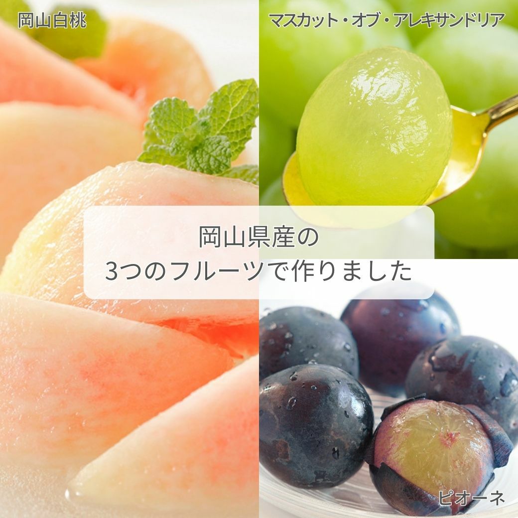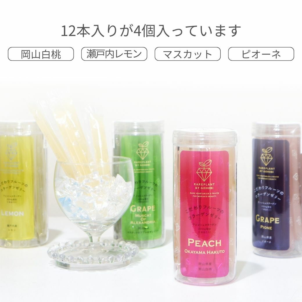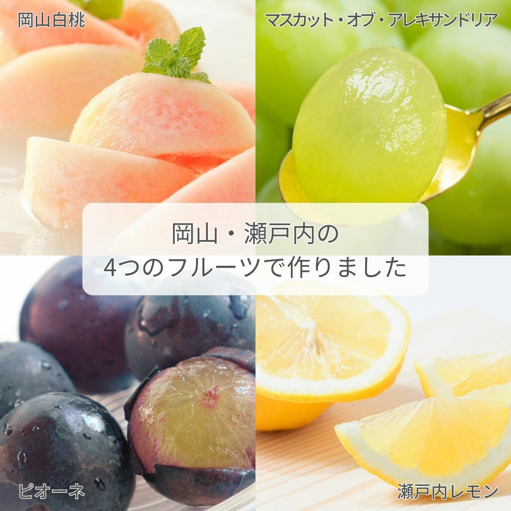 他の画像を見る 岡山と瀬戸内のフルーツの魅力を詰め込んだ、大切な方へ贈りたいギフト フルーツコラーゲンゼリー12本4個セット(桃・マスカット・ピオーネ・レモン)|RAREPLANT 販売価格 ¥ 4,130 税込 詳細を見る お気に入りに登録する